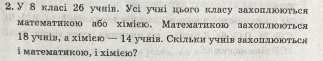 2. у 8 класі 26 учнів. Усі учні цього класу захоплюються математикою або хімією. Математикою захоплюються 18 учнів, а хімією - 14 учнів. Скільки учнів захоплюються і математикою, і хімією,