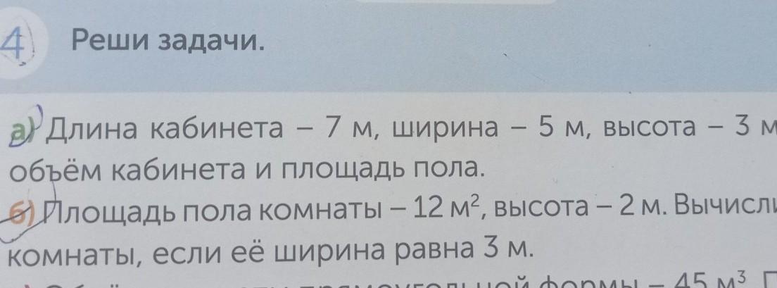 4. Реши задачи. а) Длина кабинета – 7 м, ширина – 5 м, высота – 3 м. Узнай объём кабинета и площадь пола. - 8) Площадь пола комнаты – 12 м², высота – 2 м. Вычисли объём - комнаты, если её ширина равна 3 м.