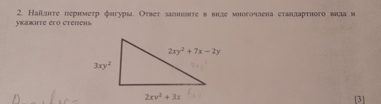 2. Найдите периметр фигуры. Ответ запишите в виде многочлена стандартного вида и укажите его степень 3ху2 2xy2 +7x-2y 2xv² + 3x