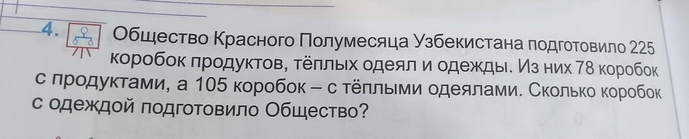 4. Общество Красного Полумесяца Узбекистана подготовило 225 коробок продуктов, тёплых одеял и одежды. Из них 78 коробок - с продуктами, а 105 коробок - с тёплыми одеялами. Сколько коробок с одеждой подготовило Общество?