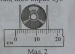 2. Визначити ціну поділки шкали лінійки та площу круга, обмеженого компакт- диском (мал.2).