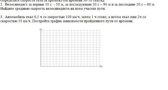 2. Велосипедист за первые 10 с - 30 м, за последующие 30 с - 90 м и за последние 20 с - 60 м. Найдите среднюю скорость велосипедиста на всем участке пути. 3. Автомобиль ехал 0,5 ч со скоростью 100 км/ч, затем 1 ч стоял, а потом ехал еще 2ч со скоростью 50 км/ч. Постройте график зависимости пройденного пути от времени.