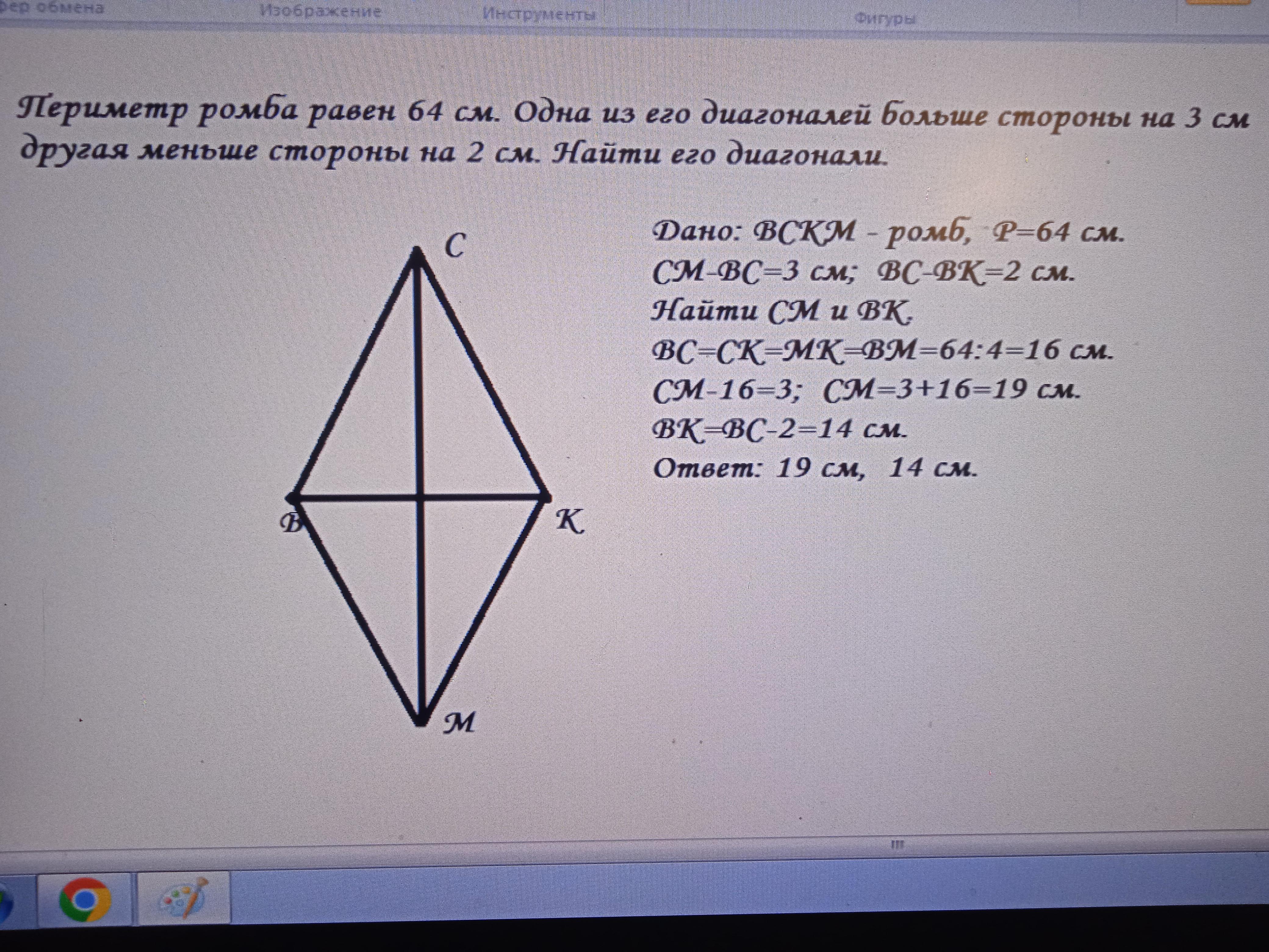 периметр ромба равен 64 см. Одна из его диоганалей больше стороны на 3 см , другая меньше стороны на 2 см. Найти его диагонали