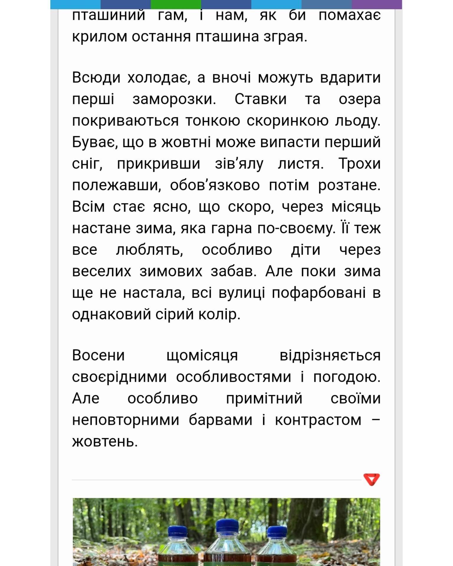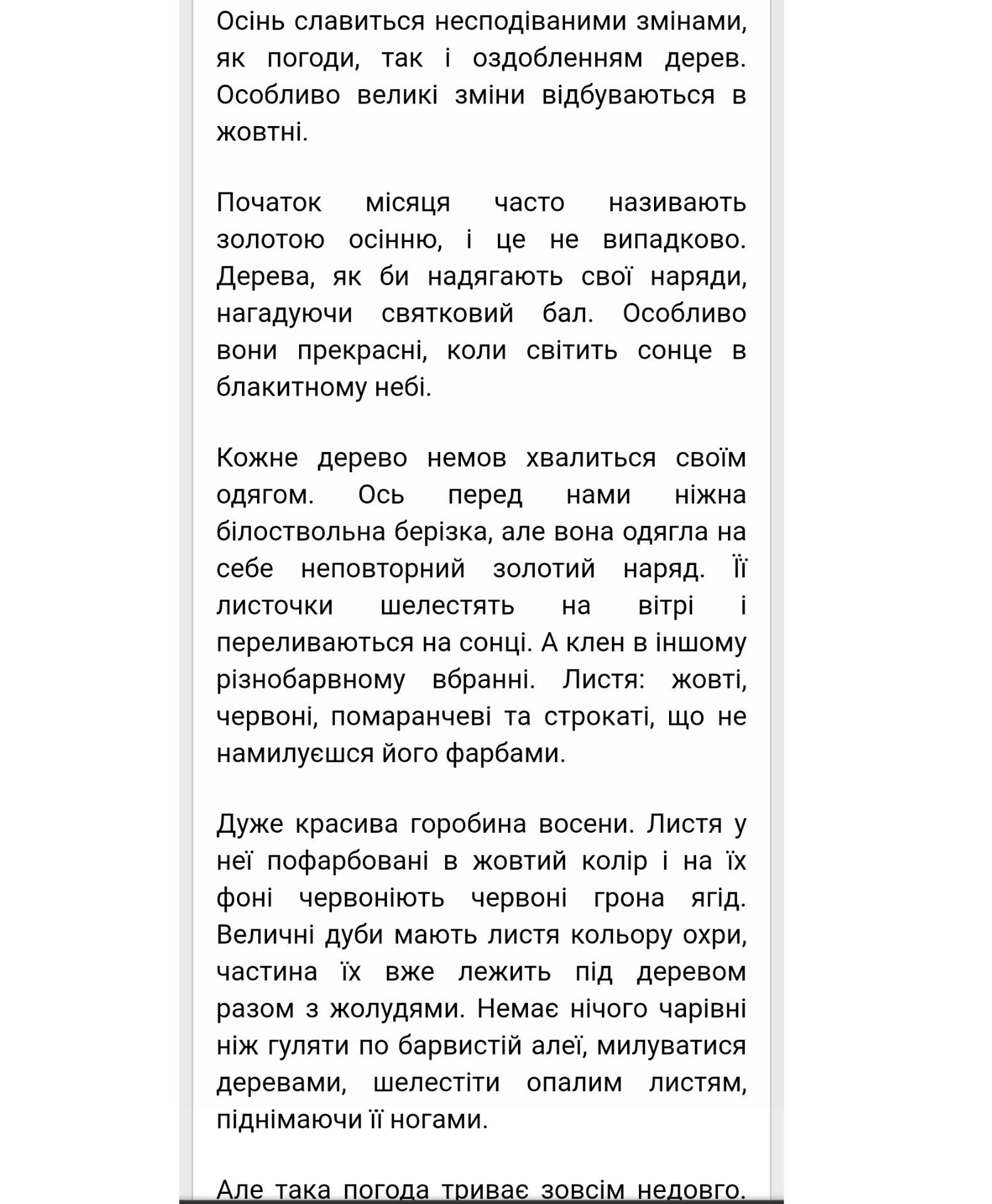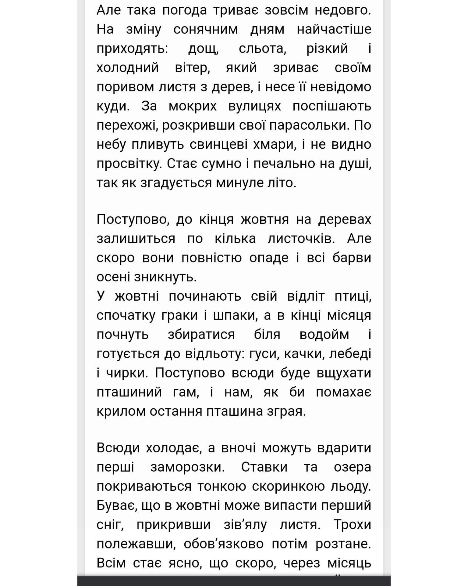 Для мене ця пора року дуже гарна.Чарівниця осінь чаклує над усією природою.Легенький вітерець віє на вулиці.Треба вже вдягатися тепло.