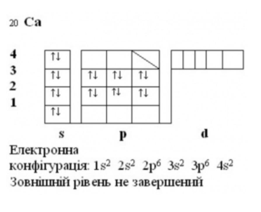 3. Будова атома: Заряд ядра +20, ядро містить 20 протонів, 20 нейтронів, в електронній оболонці-20 електронів. Електронна оболонка складається з чотирьох енергетичних рівнів. На зовнішньому рівні-2 спарені електрони (4s2 ). Будова електронної оболонки:(фото)