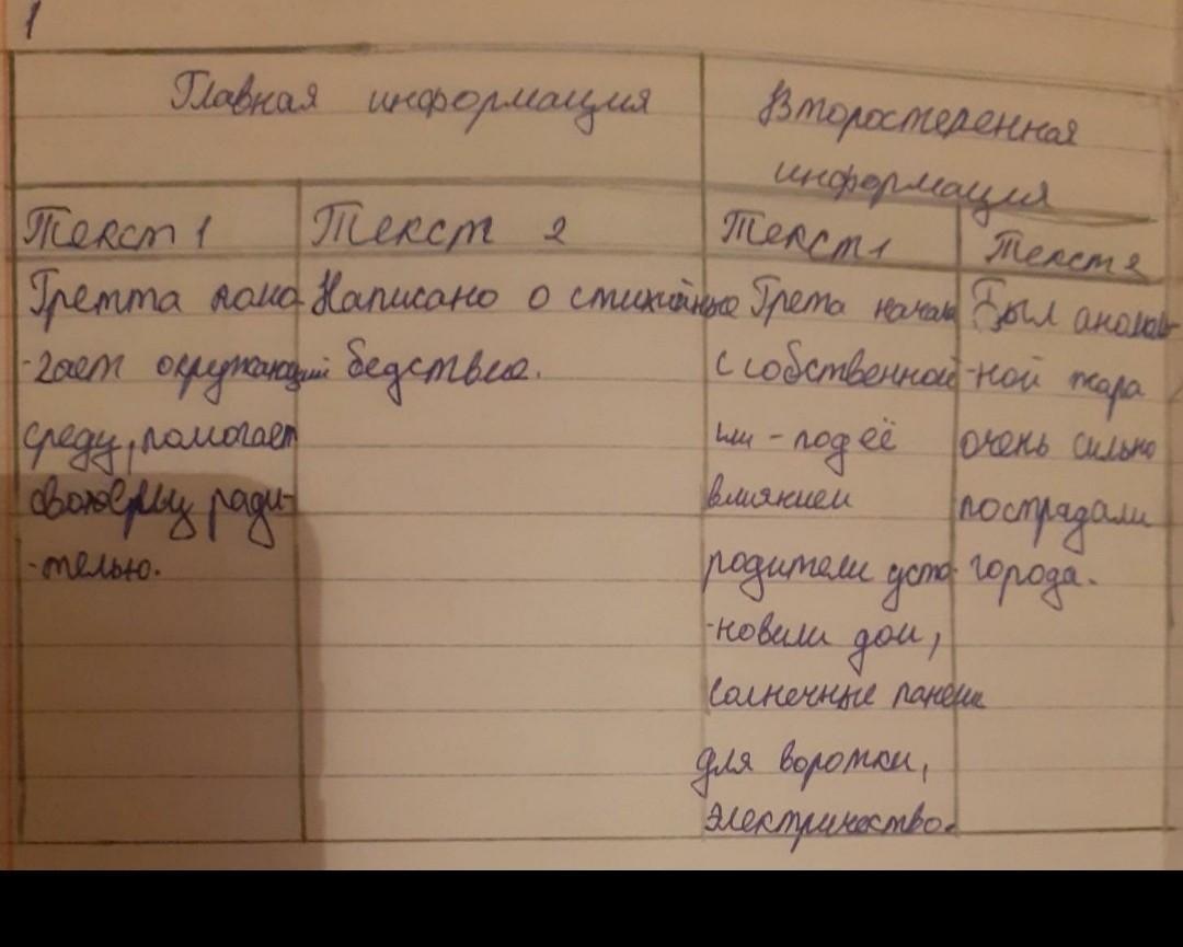 1. Заполните таблицу, выписав из каждого текста по 2 главных и 2 второстепенных факта Второстепенная информация Текст Главная информация Текст 1 Текст 2 Текст 2 по русскому язуку