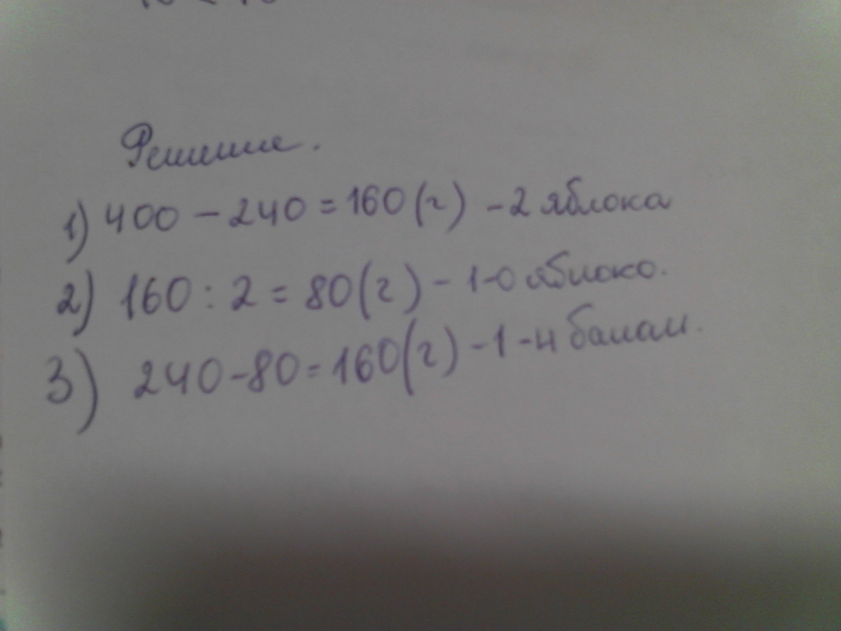 Банан с яблоком весят 240г, а банан с тремя такими же яблоками весят 400г. Сколько весит банан и сколько яблоко?