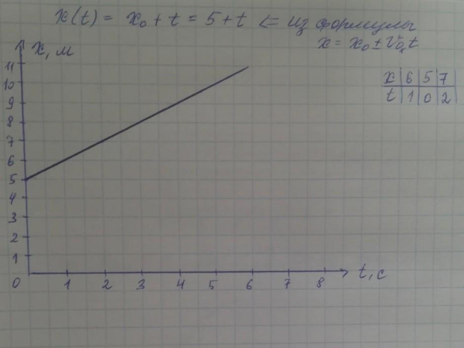 3. x(t). Пользуемся основным законом кинематики, подставляем известные значения x0, V0 и получаем функцию вида x=5+t.