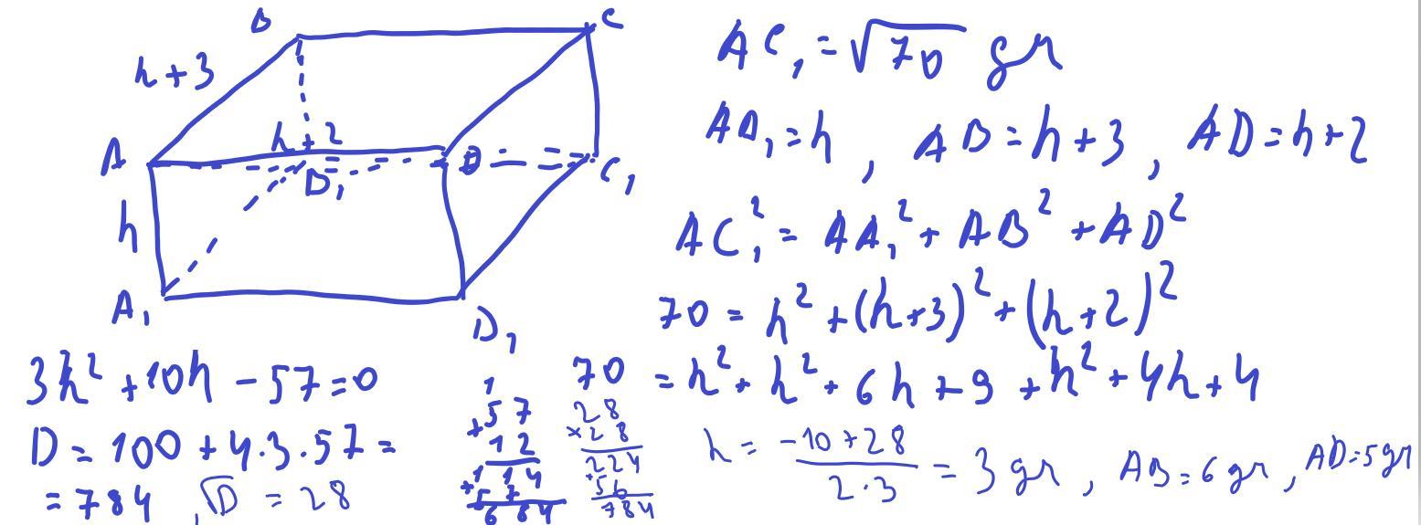 Діагональ прямокутного паралелепіпеда дорівнює корінь 70дм Його ширина на 3дм більша за висоту яка на 2дм менша за довжину Знайти площу площу повноі поверхні паралелепіпеда. Помогите пожалуйста