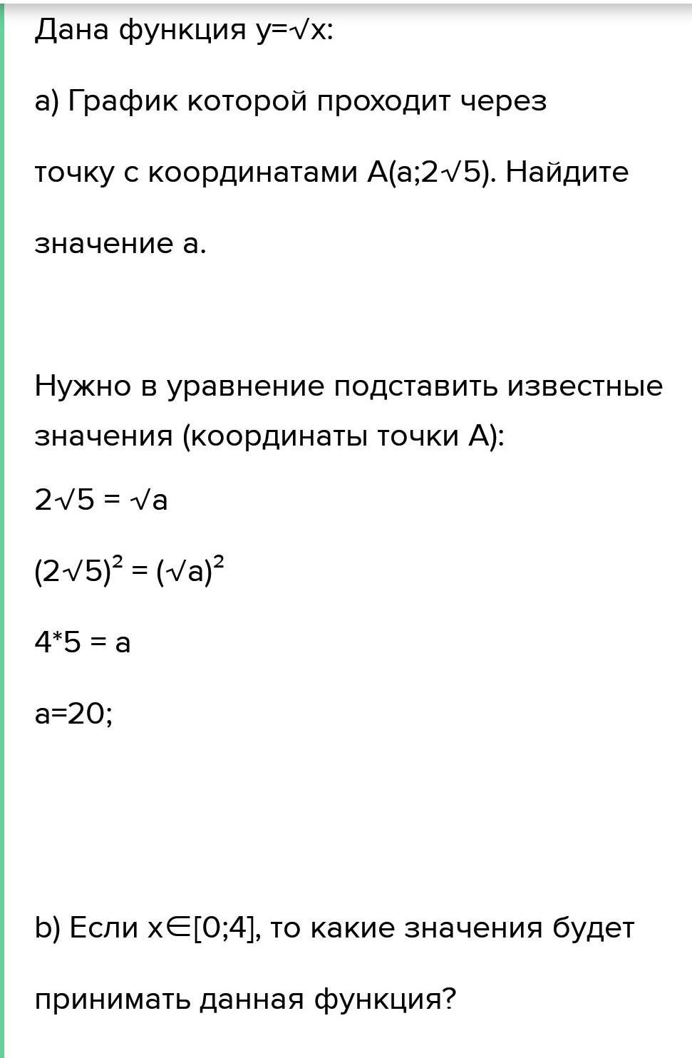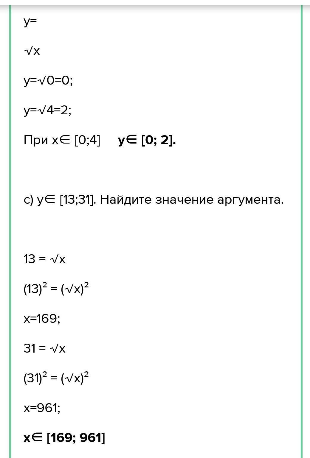 7. Дана функция у = √x . а) Найдите координаты точки А, принадлежащей графику функции y=√x, если известно, что: 1) абсцисса этой точки paBHa 16; 2) ордината этой точки равна 16. b) Если х € [1; 8], то какие значения будет принимать у; c) у є [7; 11]. Найдите промежуток изменения значения аргумента. d) Найдите при каких значениях х выполняется неравенство у