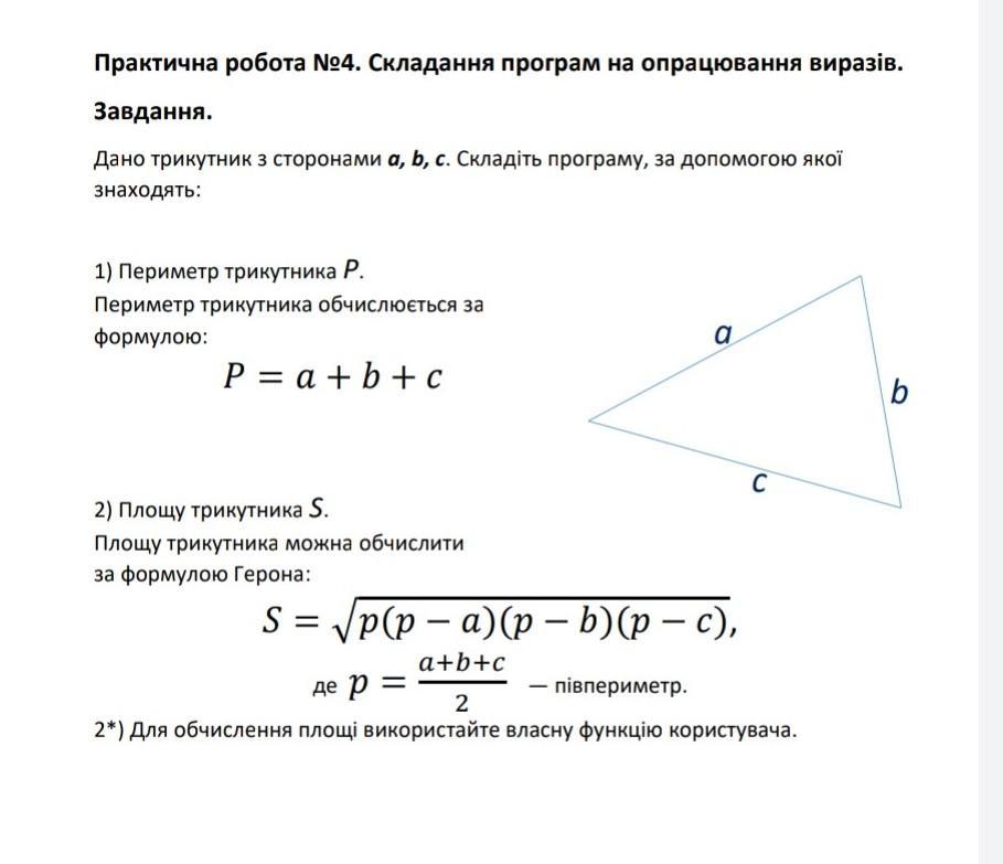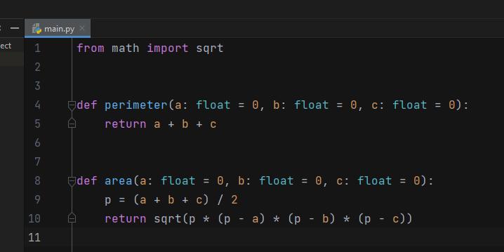 На скриншоте. Написал 2 функции, первая для периметра, вторая для площи. Импортировал корень из библиотеки math.