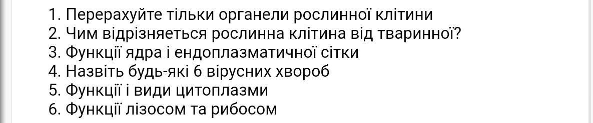 1. Вакуоля, мітохондрії, рибосоми, пластиди, центріолі, лізосоми, комплекс Гольджі, мікротрубочки, мікрофіламенти.