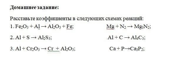 - 3.) 2AI+Cr2O3 = 2Cr+AI 4.) 3Mg+N2 = Mg3N2 5.) 4AI+3C=AI4C3