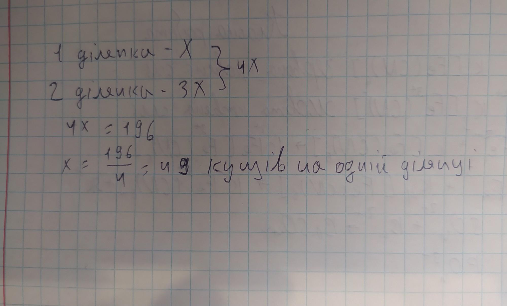 На одній ділянці росте кущів малини в 3 рази більше, ніж на іншій.Скільки кущів росте на кожній, якщо разом їх 196