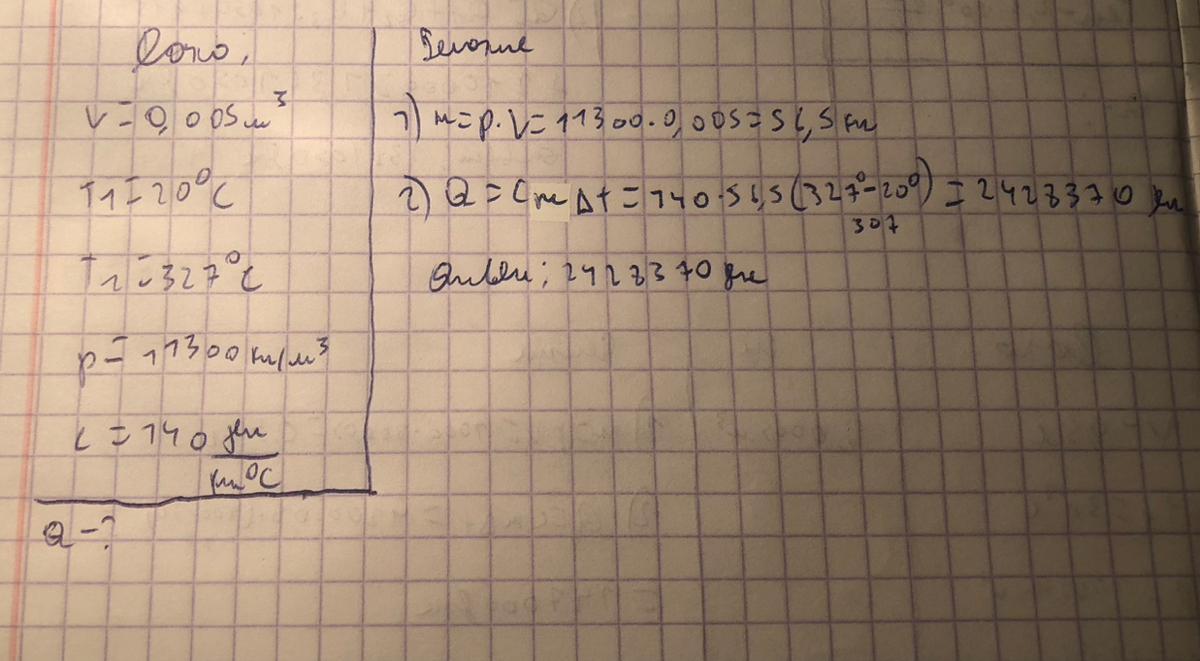 Сколько энергии потребуется для нагревания свинцовой пластинки объёмом 0.005 м³ от 20 градусов Цельсия до температуры плавления плотность свинца 11300 кг/м3 удельная теплоёмкость свинца 140 Дж/кгС, а температура плавления 327 градусов Цельсия