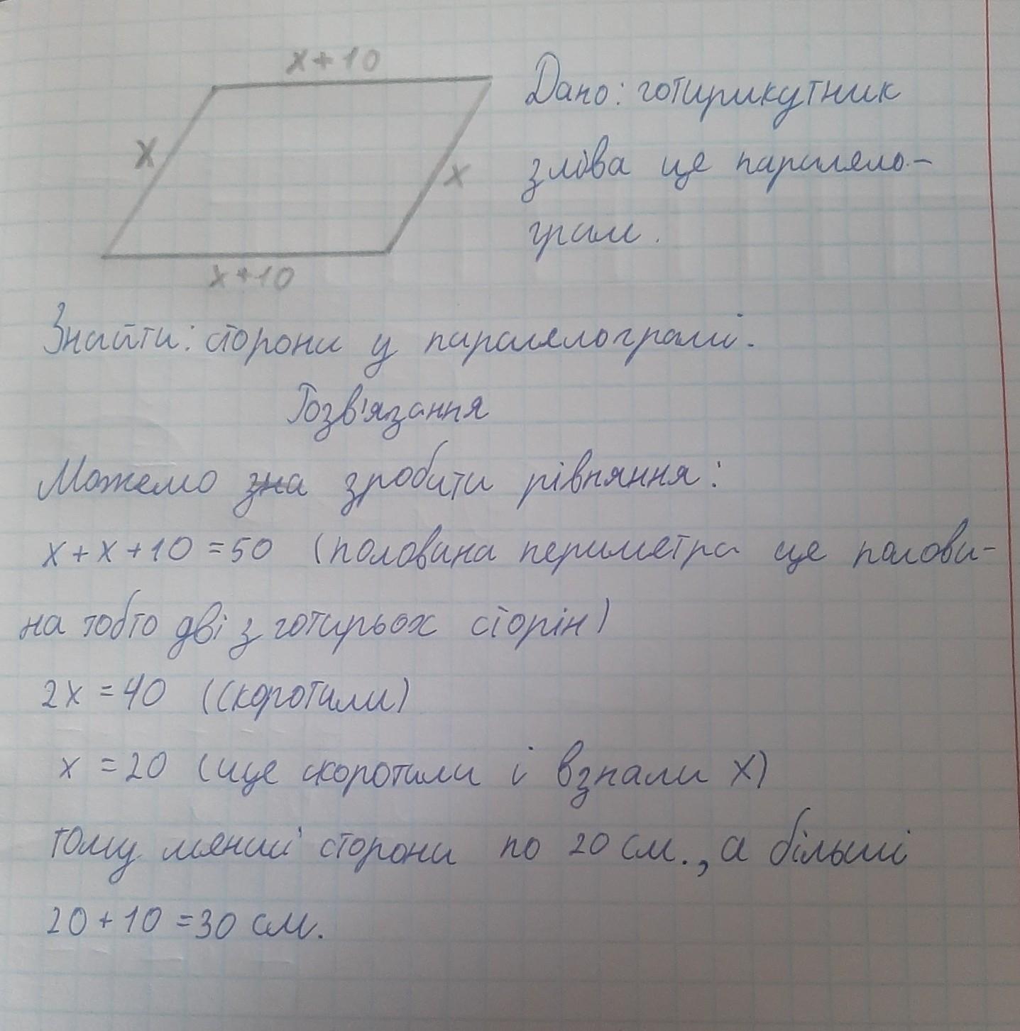 Найти стороны параллелограмма, если их разница равна 10 см , периметр параллелограмма 100 см.Ответ...