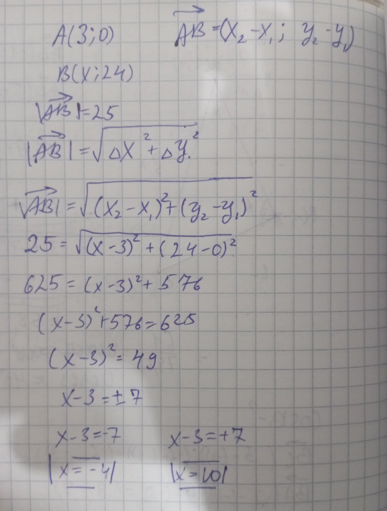 Допоможіть будь ласка. Дам 80 балів . Відстань між точками А(3;0);В(Х;24) дорівнюють 25. Знайти Х