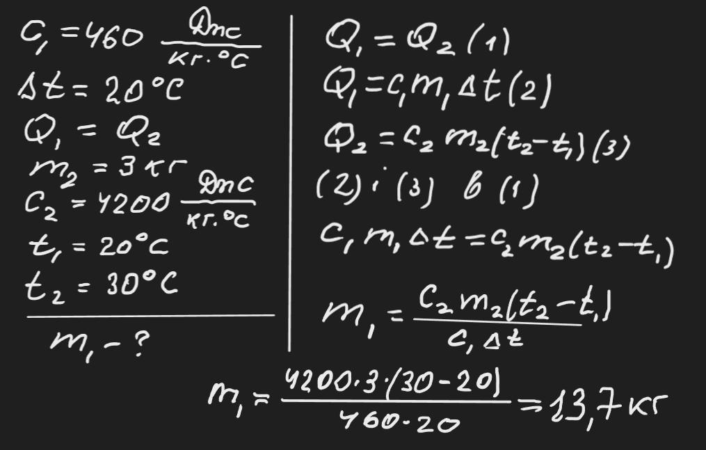 На нагрівання залізної заготовки на 20 ºС витрачено таку ж кiлькiсть теплоти, як i для нагрівання 3кг води від 20 до30 °C. Визначте масу залізної заготовки