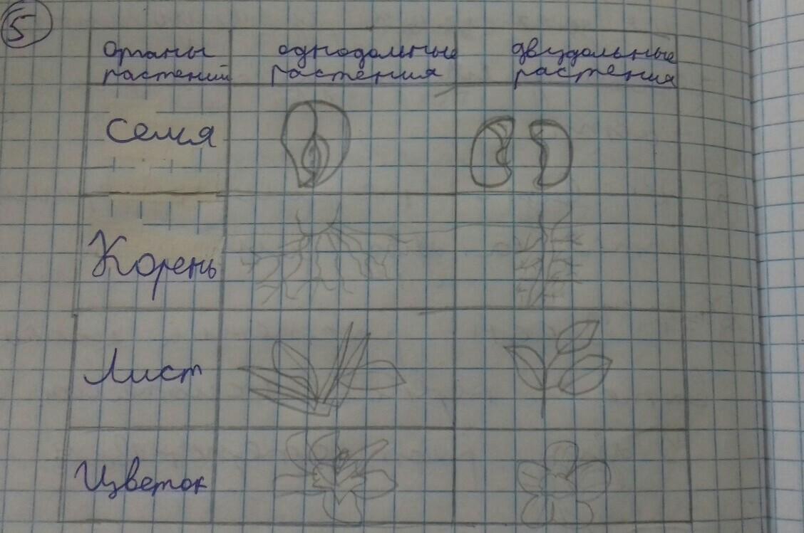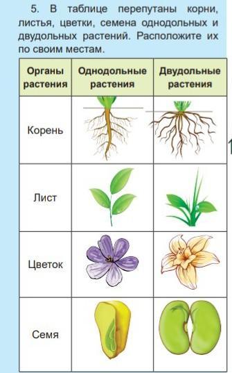 5. В таблице перепутаны корни, листья, цветки, семена однодольных и двудольных растений. Расположите их по своим местам.