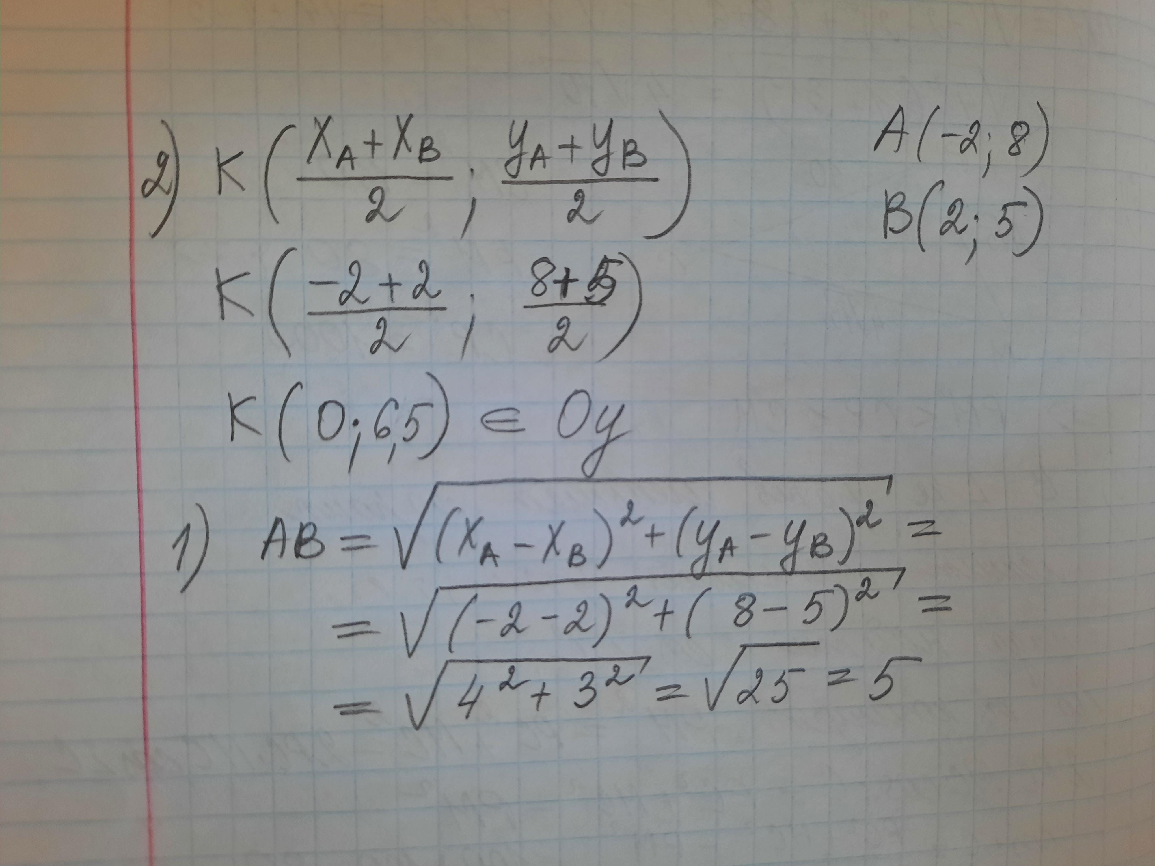 4. Точка К – середина відрізка з кінцями в точках А(-2; 8) i B(2; 5). 1) Знайдіть довжину відрізка AB; 2) Чи належить точка К осі ординат?