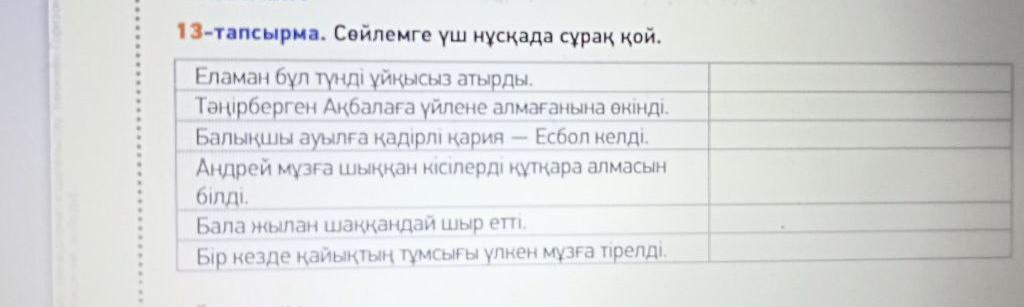 13-тапсырма. Сейлемге үш нұсқада сурак кой.