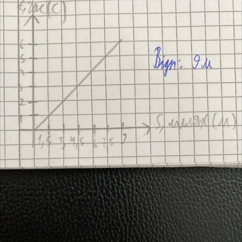 5. Турист йде зі швидкістю 1,5 м/с. Побудуйте графік залежності шлях від часу і знайдіть за допомогою цього графіка шлях. Пройдений за 6 с.
