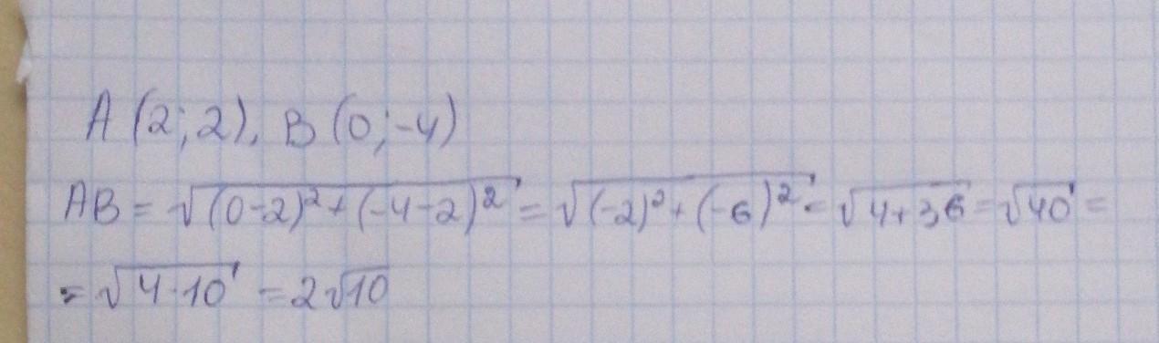 Дани точки А(2:2), В(0;-4) Найти расстояние между данными точками . ПОМОГИТЕ С ЭТОЙ ЗАДАЧЕЙ дам 30 балов