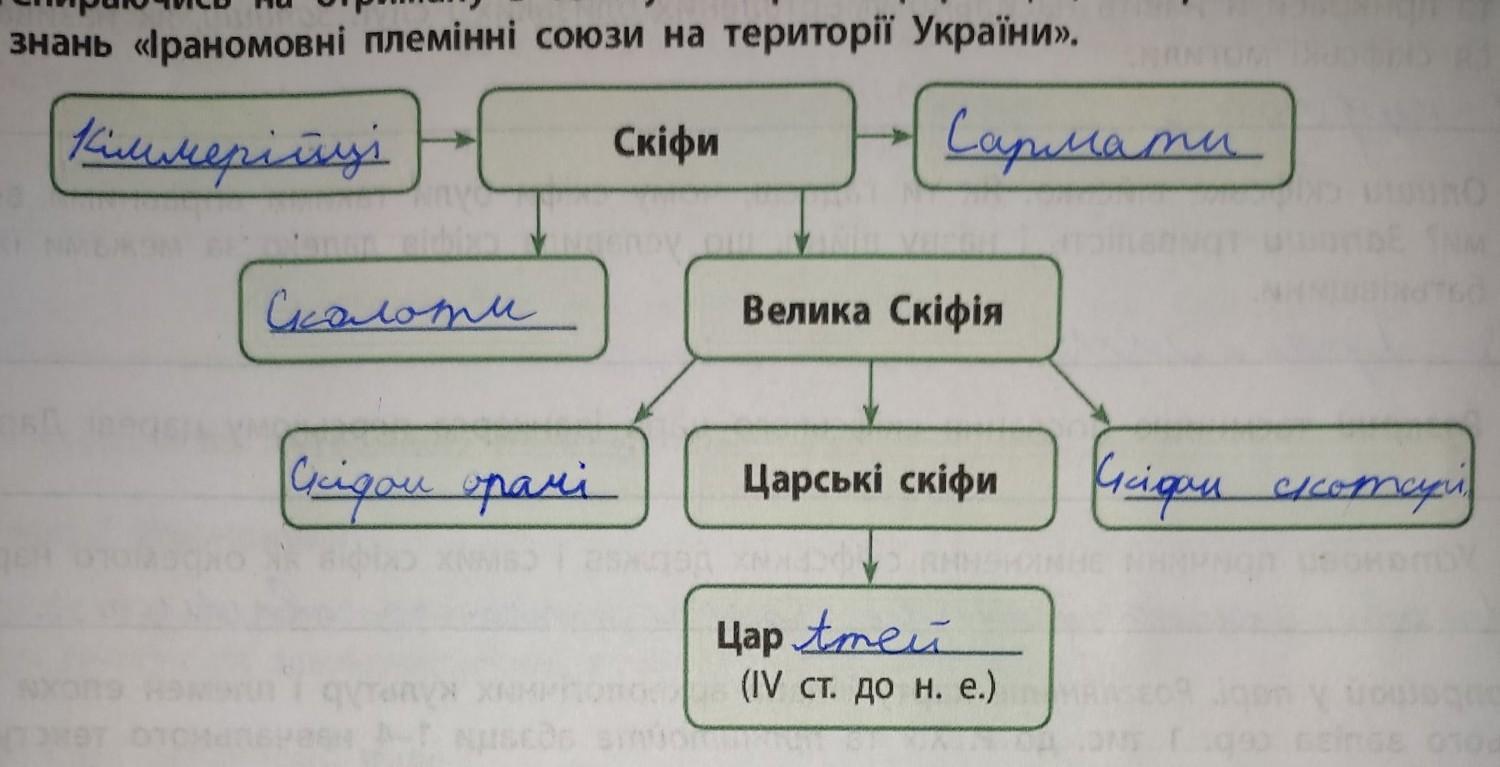 3.3.3. Спираючись на отриману з тексту й карти інформацію, заверши заповнення карти знань «Іраномовні племінні союзи на території України». Скіфи Велика Скіфія Царські скіфи Цар (IV ст. до н. е.)