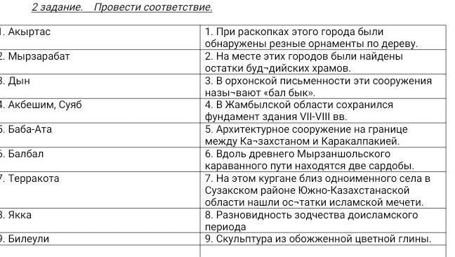 2 задание. Провести соответствие. 1. Акыртас 2. Мырзарабат 3. Дын 7. Акбешим, Суяб 5. Баба-Ата 5. Балбал 2. Терракота 3. Якка Э. Билеули оппо Атоотит 1. При раскопках этого города были обнаружены резные орнаменты по дереву. 2. На месте этих городов были найдены остатки буд-дийских храмов. 3. В орхонской письменности эти сооружения назы-вают «бал бык>>. 4. В Жамбылской области сохранился фундамент здания VII-VIII вв. 5. Архитектурное сооружение на границе между Ка¬захстаном и Каракалпакией. 6. Вдоль древнего Мырзаншольского караванного пути находятся две сардобы. 7. На этом кургане близ одноименного села в Сузакском районе Южно-Казахстанаской области нашли ос-татки исламской мечети. 8. Разновидность зодчества доисламского периода 9. Скульптура из обожженной цветной глины.