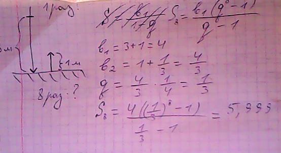 Падая с некоторой высоты, резиновый мяч отскакивает от пола на одну треть высоты падения. Какой путь пройдёт мяч, упавший с высоты 3м, к тому моментку, когда он коснется пола в 8-й раз?
