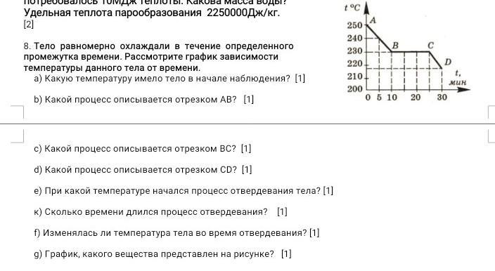 8. Тело равномерно охлаждали в течение определенного промежутка времени. Рассмотрите график зависимости температуры данного тела от времени. е) При какой температуре начался процесс отвердевания тела? [1] f) Изменялась ли температура тела во время отвердевания? [1] g) График, какого вещества представлен на рисунке? [1] а) Какую температуру имело тело в начале наблюдения? [1] к) Сколько времени длился процесс отвердевания? [1] d) Какой процесс описывается отрезком CD? [1] c) Какой процесс описывается отрезком ВС? [1] b) Какой процесс описывается отрезком AB? [1]