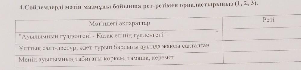 4.Сөйлемдерді мәтін мазмұны бойынша рет-ретімен орналастырыныз (1, 2, 3). Мәтіндегі ақпараттар "Ауылымның гүлденгенi - Казак елiнiң гүлденгенi "- Ұлттык салт-дәстүр, әдет-ғұрып барлыгы ауылда жаксы сакталган Менiн ауылымнын табигаты көркем, тамаша, керемет Реті СРОЧНО ПОМОГИТЕ ПОЖАЛУЙСТА ДАМ 80 БАЛЛОВ