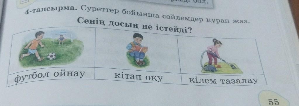 4-тапсырма. Суреттер бойынша сөйлемдер құрап жаз. Сенің досын не істейді? футбол ойнау кешірімді бол. кітап оқу кілем тазалау 55 помогите пожалуйста мне