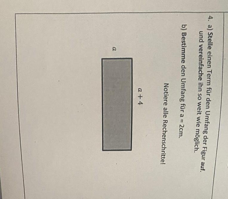 4. a) Stelle einen Term für den Umfang der Figur auf. und vereinfache ihn so weit wie möglich. b) Bestimme den Umfang für a = 2cm. a Notiere alle Rechenschritte! a +4