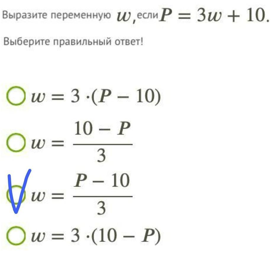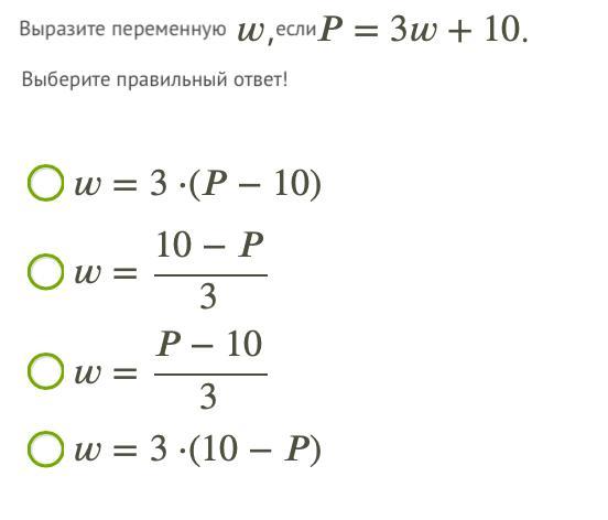 Выразите переменную w, если P = 3w + 10
