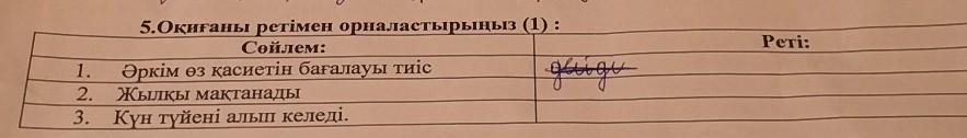 5.Окаганы ретімен орналастырыныз (1) : Сайлем: Әркім өз каснетін бағалауы тиiс 1. 2. Жылкы мақтанады 3. Күн гуйенi алып келеді. Peri: