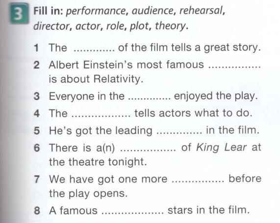 1.Plot 2.Actor 3.Audience 4.Director 5.Role 6.Perfomance 7.Rehearsal 8.
