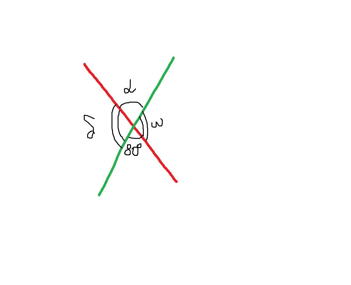 7) Один із чотирьох кутів, що утворилися в результаті перетину двох пря мих, дорівнює 80°. Чому дорівнює решта кутів?