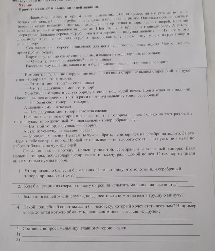 сь текст. Расскажи его. Чтение Прочитай сказку и выполни к ней задания. Давным-давно жил в горном селении мальчик. Отец его умер, мать с утра до ночи на чужих работала, а мальчик рубил в лесу дрова и продавал на рынке. Однажды осенью, когда с деревьев опали последние листья, а холодный ветер загнал в норы лесных зверей, мальчик взял свой топор и отправился за дровами шел он, шел и пришел к горному озеру А у того озера росло большое дерево. «Срублю-ка я это дерево, - подумал мальчик. - Из него много дров получится». Только стал он рубить дерево, как вдруг выскользнул у него из рук топор и упал в озеро. Сел мальчик на берегу и заплакал: для него ведь топор дороже золота. Чем он теперь дрова рубить будет? Вдруг загуляли по озеру синие волны, и вышел из вод старичок старенький. О чем ты, мальчик, плачешь? - спрашивает. Рассказал ему мальчик, какая с ним беда приключилась, а старичок и говорит: Вот опять загуляли по озеру синне волны, и из воды старичок вышел старенький, а в руке у него топор из чистого золота. -Этот ли топор твой? - спрашивает. Что ты, дедушка, не мой это топор! Усмехнулся старик в седую бороду и снова под водой исчез. Долго ждал его мальчик. Наконец вышел старичок в третий раз и протянул мальчику топор серебряный. На, бери свой топор, - говорит. А мальчик ему и отвечает: Нет, дедушка, мой топор из железа сделан. И снова погрузился старик в озеро, и опять с топором вышел. Только на этот раз был у него в руках топор железный. Увидал мальчик топор, обрадовался. -Вот мой топор, дедушка, - говорит. А старик усмехнулся ласково и сказал: Молодец, мальчик. Не стал ты чужого брать, не позарился на серебро да золото. За это отдам я тебе все три топора. Продай их на рынке - они дорого стоят, - и пусть твоя мама не работает больше на чужих людей. Сказал он так и протянул мальчику золотой, серебряный и железный топоры. Взял мальчик топоры, поблагодарил старика сто и тысячу раз и домой пошел. С тех пор не знали они с матерью нужды и горя.