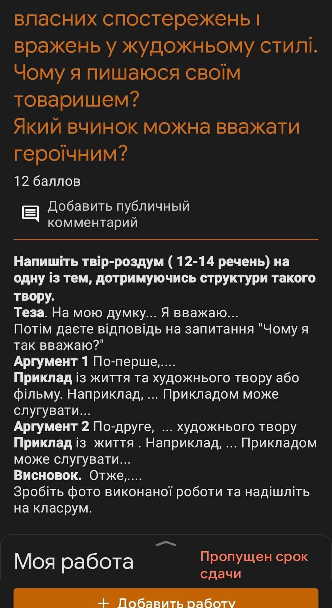 від героїв твору, який я навів/вела у прикладі. Ми завжди розмовляємо на цікаві теми. Також він дуже сміливий, може відстояти свої права й думки, аргументуючи їх.