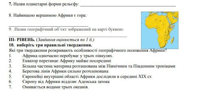 7. Назви планетарні форми рельєфу: __________________________________________ 8. Найвищою вершиною Африки є гора: ___________________________________ 9. .Назви географічний об’єкт зображений на карті буквою: ____________________________________________________ ІІІ- РІВЕНЬ. (Завдання оцінюється по 1 б.) 10. виберіть три правильні твердження. Які три твердження розкривають особливості географічного положення Африки? 1. Африка одночасно перебуває у трьох півкулях. 2. Екватор перетинає Африку майже посередині 3. Більша частина материка розташована між Північним та Південним тропіками 4. Берегова лінія Африки сильно розчленована 5. Європейці внутрішні області Африки дослідили в середині ХІХ ст. 6. Європу від Африки відділяє Аденська затока 7. Омивається водами трьох океанів.
