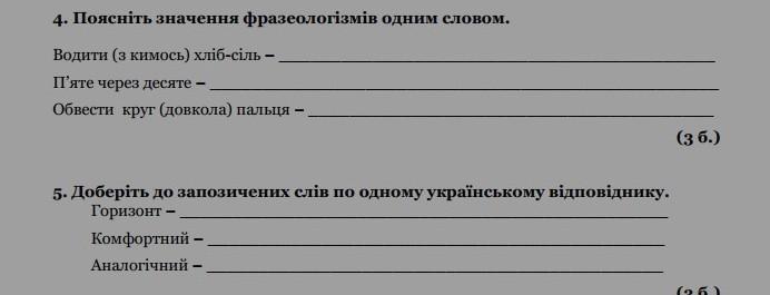 4. Поясніть значення фразеологізмів одним словом. Водити (з кимось) хліб-сіль - П'яте через десяте - Обвести круг (довкола) пальця - 5. Доберiть до запозичених слів по одному українському вiдповiднику. Горизонт комфортний - Аналогічний (3 б.)