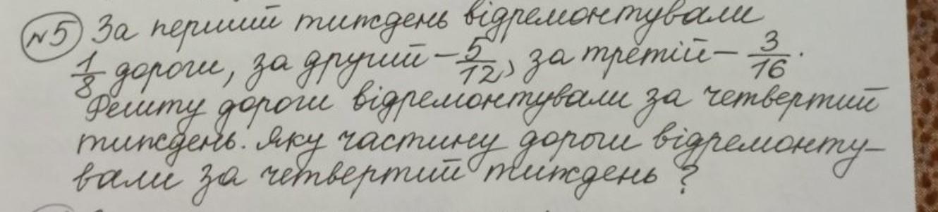 За первую неделю отремонтировать 1/8 дороги, за вторую 5/12, за третью 3/16. Решту дороги отремонтировали за 4 неделю. Какую часть дороги отремонтировали за 4 неделю?