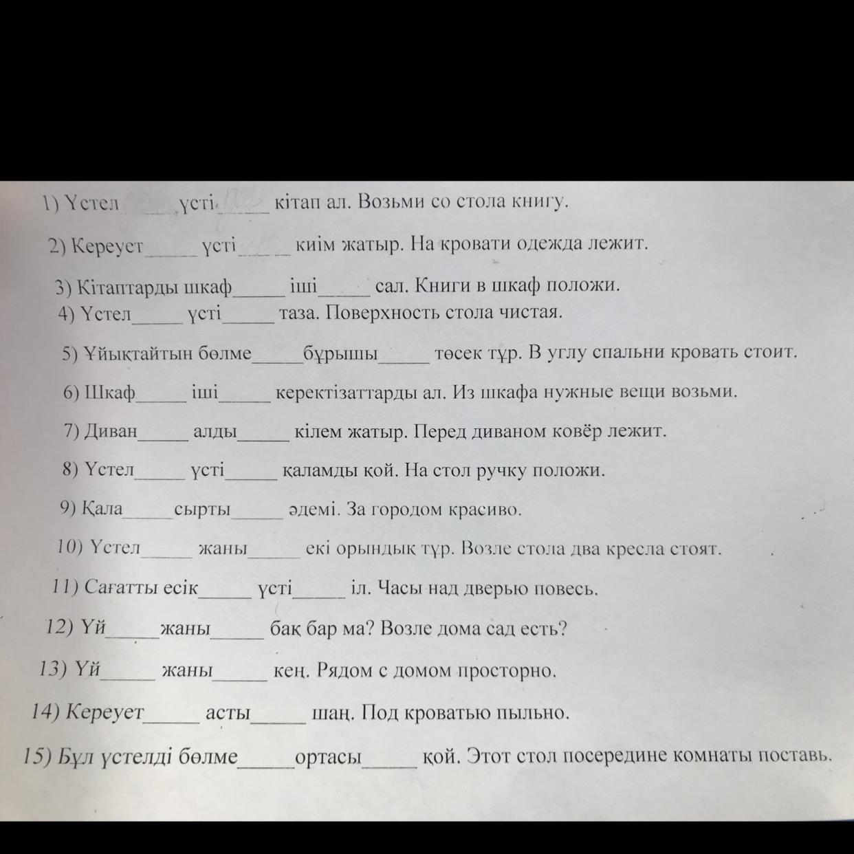 Зат есімге ілік септігін жаз. Көмекші есімдерге жатыс, шығыс немесе барыс септігін керек жерде ғана жаз
