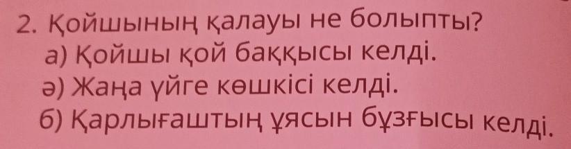 2. Қойшының қалауы не болыпты? а) Қойшы қой баққысы келді. ә) Жаңа үйге көшкісі келді. б) Қарлығаштың ұясын бұзғысы келді.