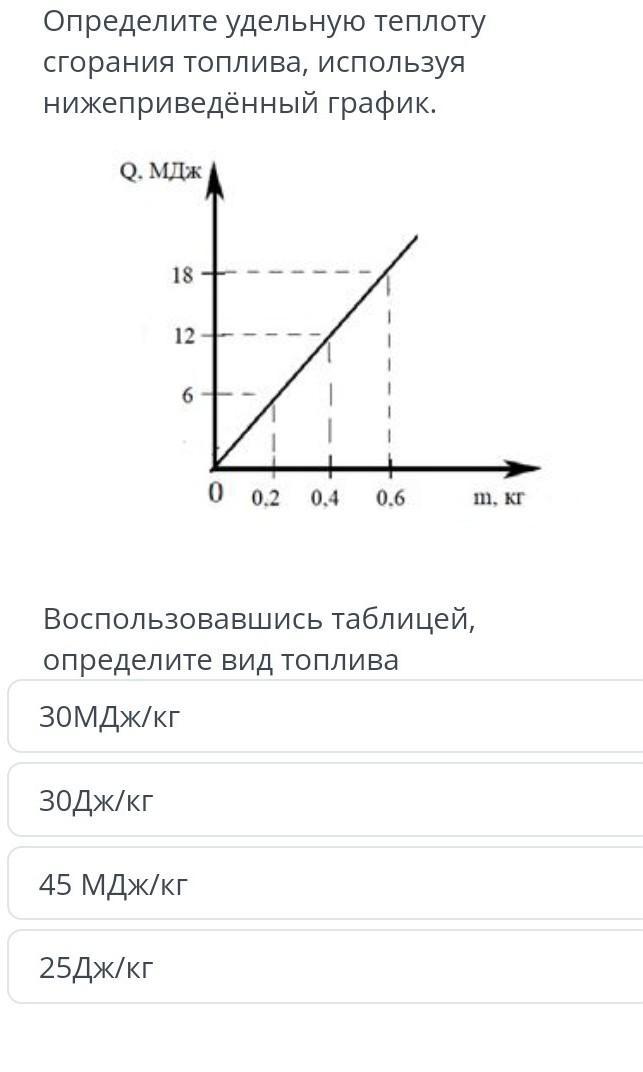 Определите удельную теплоту сгорания топлива, используя нижеприведённый график. Q. МДж 30Дж/кг 18 12 25Дж/кг 6 45 МДж/кг 0 Воспользовавшись таблицей, определите вид топлива 30МДж/кг