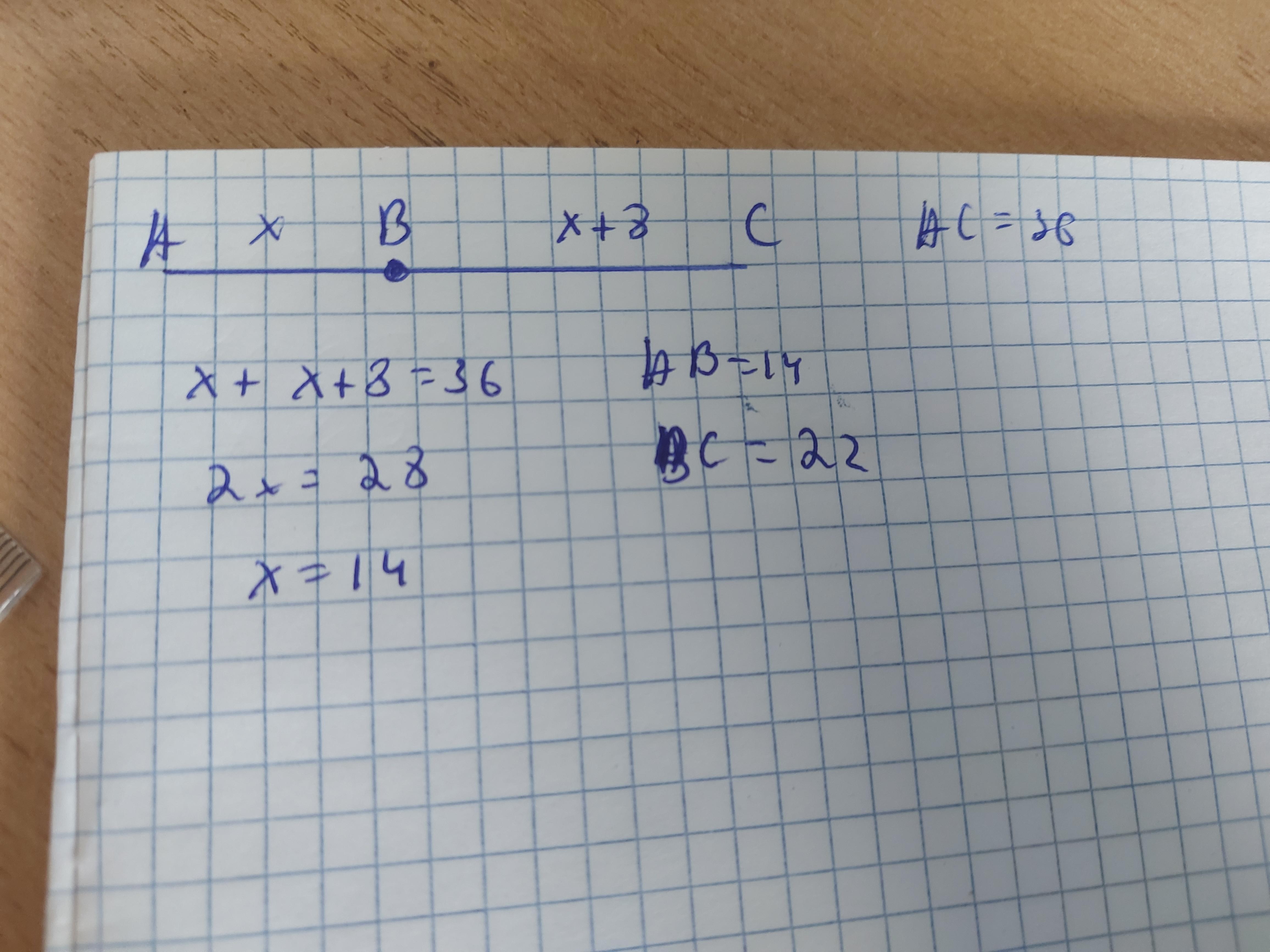 3. Нехай АВ = х см , тоді ВС = ( х + 8 ) см .