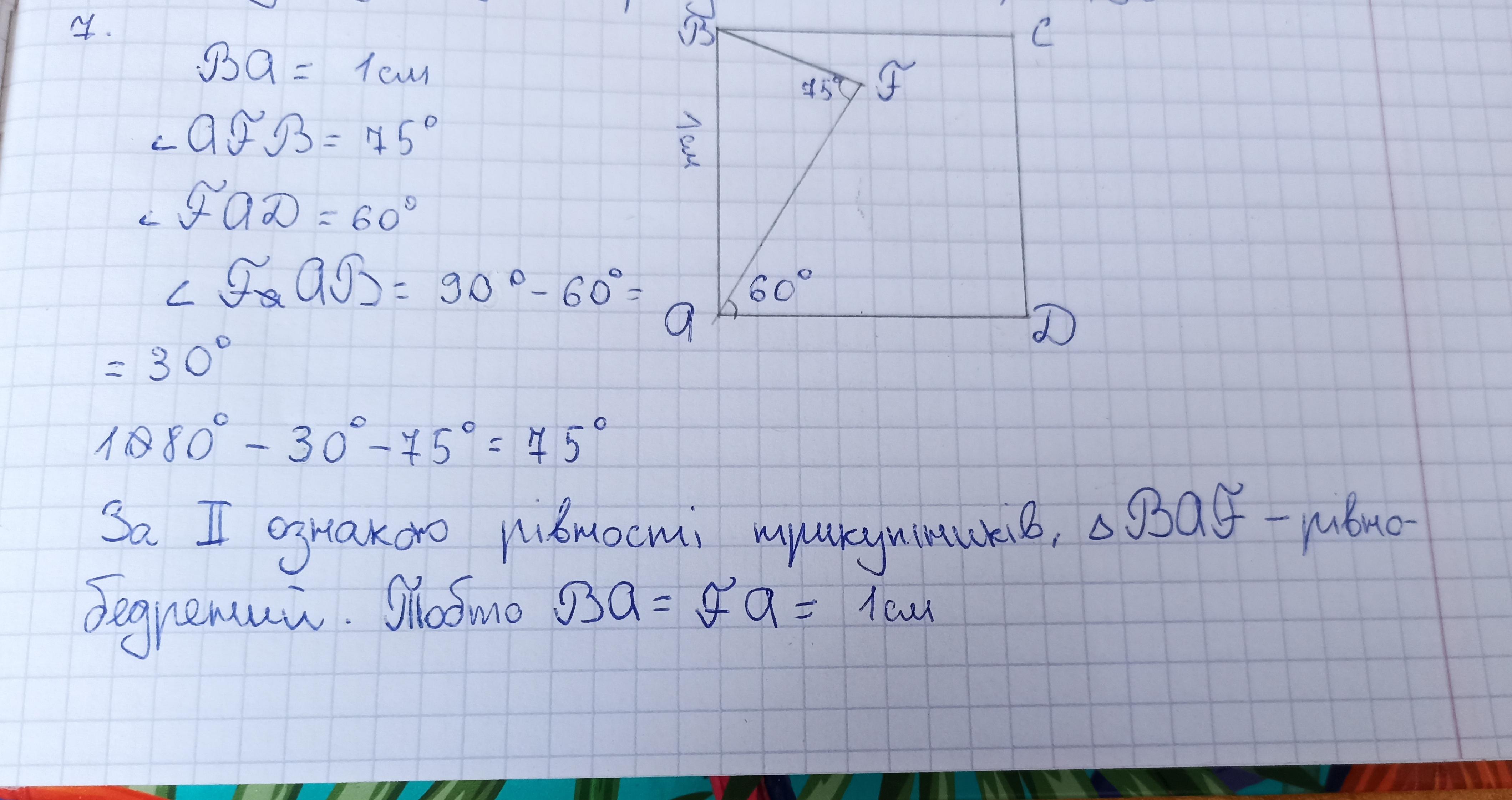 7. У внутрішній області квадрата, сторона якого дорівнює 1 см, розташована точка F, так, що кут AFB дорівнює 75°, а кут FAD - 60°. Знайдіть довжину вiдрiзка AF.