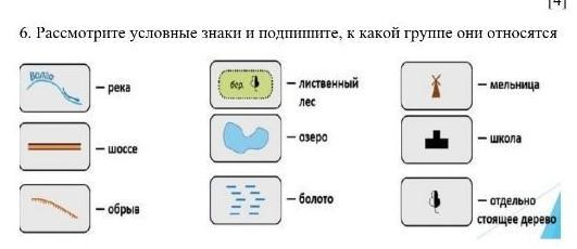 6. Рассмотрите условные знаки и подпишите, к какой группе они относятся