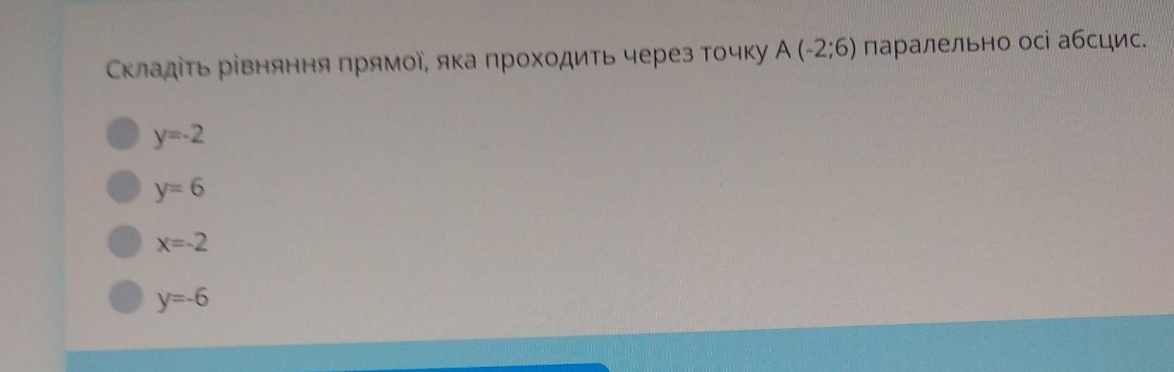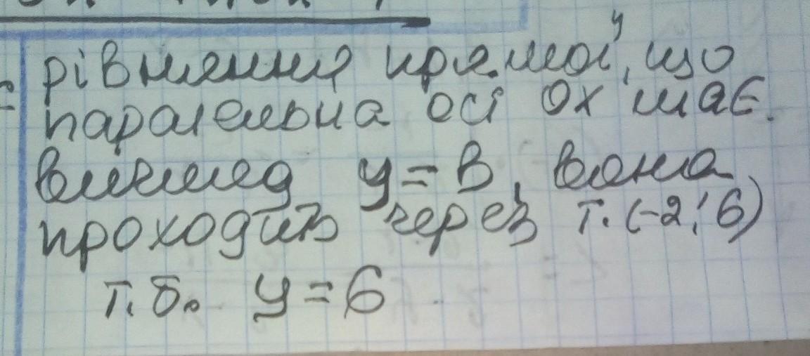Складіть рівняння прямої, яка проходить через точку А (-2;6) паралельно осі абсцис.